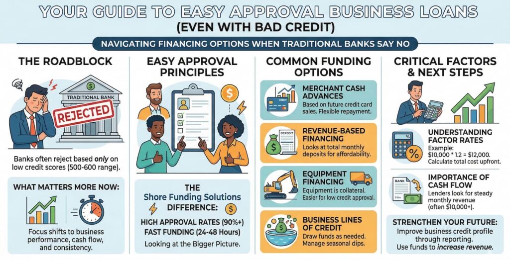 When people speak about easy approval, they are usually referring to a speedier and more flexible process. At Shore Funding Solutions, the focus remains on your business performance rather than just your past financial hurdles. By looking at your revenue and time in business, lenders can offer approvals that seem out of reach at a standard bank.